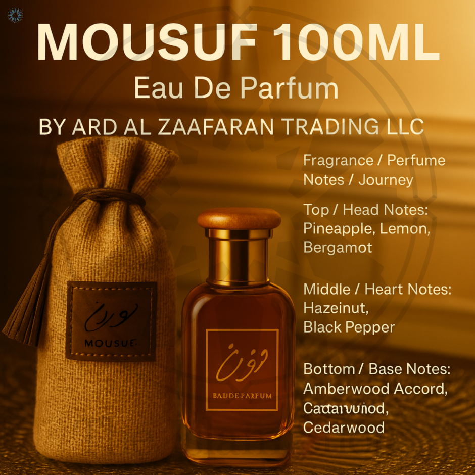 Main Accords: The main accords of Mousuf unfold in a richly layered harmony. It opens with a fresh fruity-citrus accord, led by pineapple, lemon, and bergamot, delivering an energetic and uplifting first impression. This smoothly transitions into a warm nutty-spicy accord, where roasted hazelnut and black pepper add depth, sensuality, and intrigue. The fragrance settles into a woody-amber accord, dominated by amberwood, patchouli, and cedarwood, providing a long-lasting, smooth, and masculine dry-down that feels both grounding and seductive.
